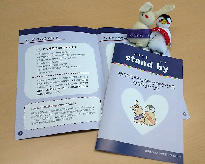 - stand by ガイドブック・・・ひきこもりの状態像や背景、周囲の人ができること等を簡単にまとめたガイドブックです。ご本人やご家族が少しでも安心して過ごせる世の中になりますように。