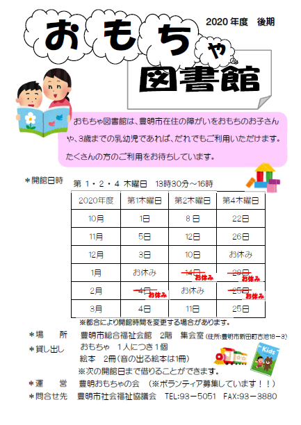 新型コロナウイルスの感染拡大防止のため、2月4日、2月25日のおもちゃ図書館を休館します。ご迷惑をおかけいたしますが、ご理解とご協力をお願いいたします。