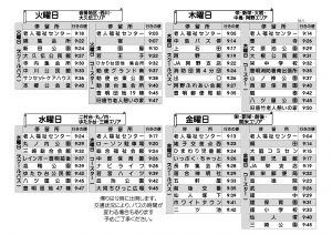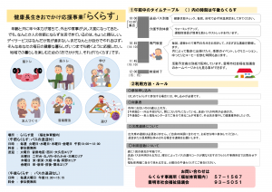 HOME > らくらす > 健康長生きおでかけ応援事業「らくらす」 らくらすバス時刻表 健康長生きおでかけ応援事業「らくらす」 らくらすバス時刻表 「らくらす」 年齢と共に年々体力が落ちて、外出や家事が少し大変になってきた。でも、なんとか人の世話にならず生活できているのは、ちょっと誇らしい。デイサービスはなんだか気が進まない。まだなんとか自分でやれるはず。 そんなあなたの毎日の健康な暮らしがいつまでも続くように応援したい。 地域での暮らしを楽しむための「おでかけ先」、それが「らくらす」です。 詳しくはチラシをご覧ください。 2024.06.10