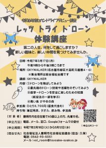 HOME > イベント・講座 > 令和6年度セカンドライフデビュー講座「レッツ トライ ドローン」体験講座参加者募集 令和6年度セカンドライフデビュー講座「レッツ トライ ドローン」体験講座参加者募集 セカンドライフを楽しむための講座を実施します。ドローンの最新技術にふれて新しい趣味と、新たな仲間を見つけてみませんか。 下記チラシをご覧のうえ、お申込みください。 2025.02.14
