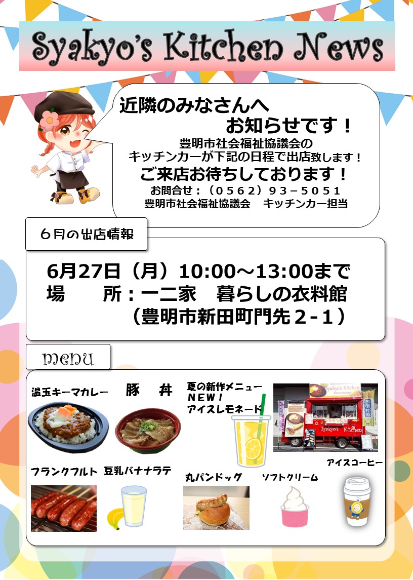 HOME > キッチンカー > 豊明社協★キッチンカーの6月の追加出店情報 豊明社協★キッチンカーの6月の追加出店情報 6月の追加出店情報です! ※クリックするとチラシが表示されます。 豊明市内の衣料品店『一二家 暮らしの衣料館』さんにてキッチンカー初出店が決まりました。皆様ぜひご来店お待ちしております。 2022.06.23