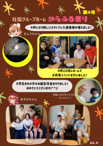 HOME > グループホームからふる > からふる便り第4号! からふる便り第4号! からふる便り第4号を発行しました! 残暑が続いていますが、少し秋らしくなってきましたね。 お月見や9月生まれの方の誕生日会を行いました。 ※クリックするとチラシをご覧いただけます。 2022.09.15