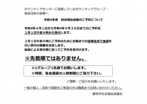 令和4年度上半期会館予約抽選会日時:2月1日午前9時~