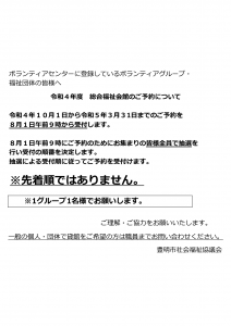 令和4年10月1日から令和5年3月31日までの予約を8月1日午前9時から受付します。