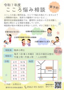 HOME > お知らせ > 令和7年度 こころ悩み相談について 令和7年度 こころ悩み相談について 令和7年度こころ悩み相談を以下の日程で行います。 詳しくは下記のチラシをご覧ください。 2025.04.08