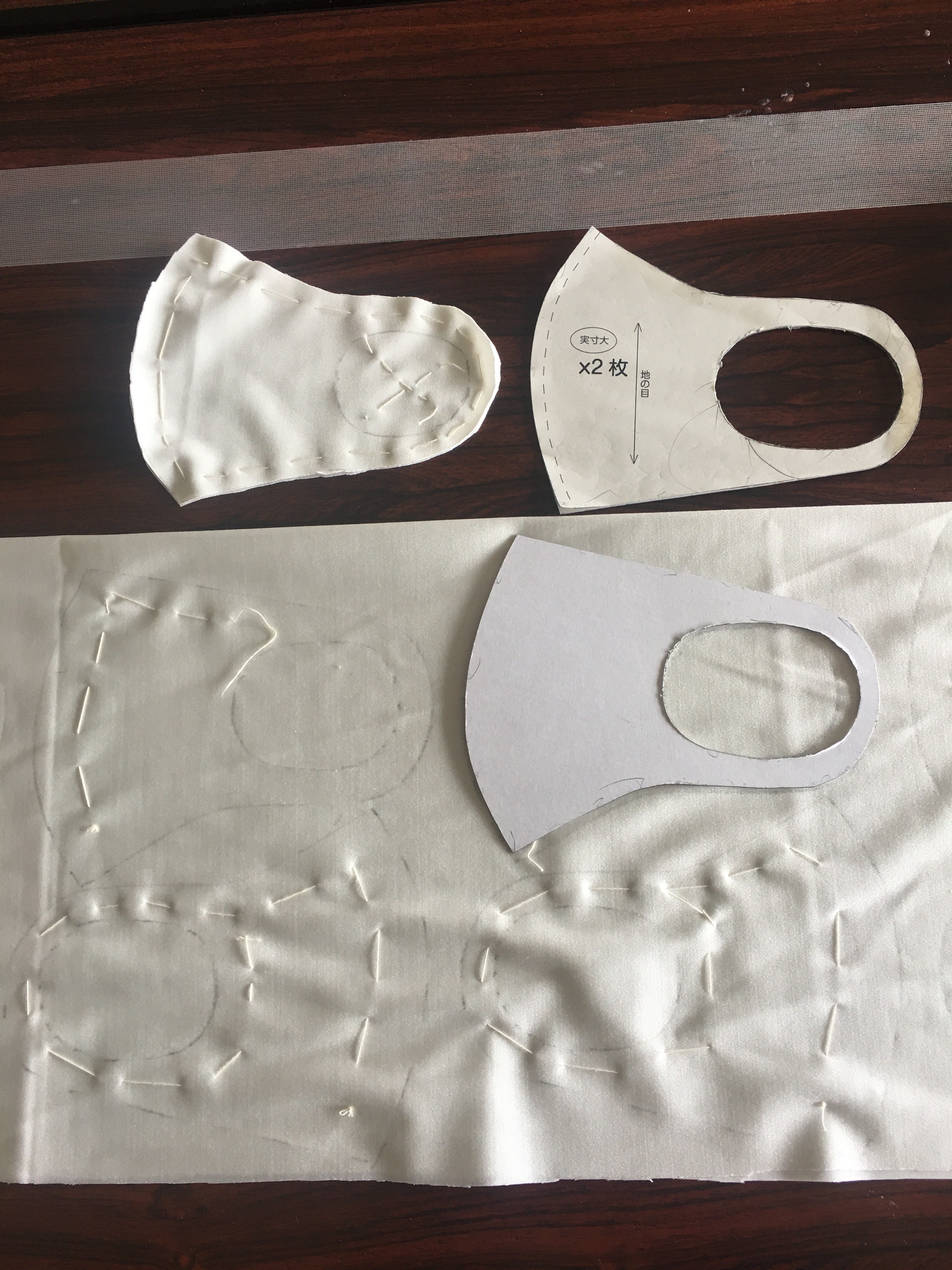 ②2枚がずれないように一部を仮縫いして、線より少し大きめに切る