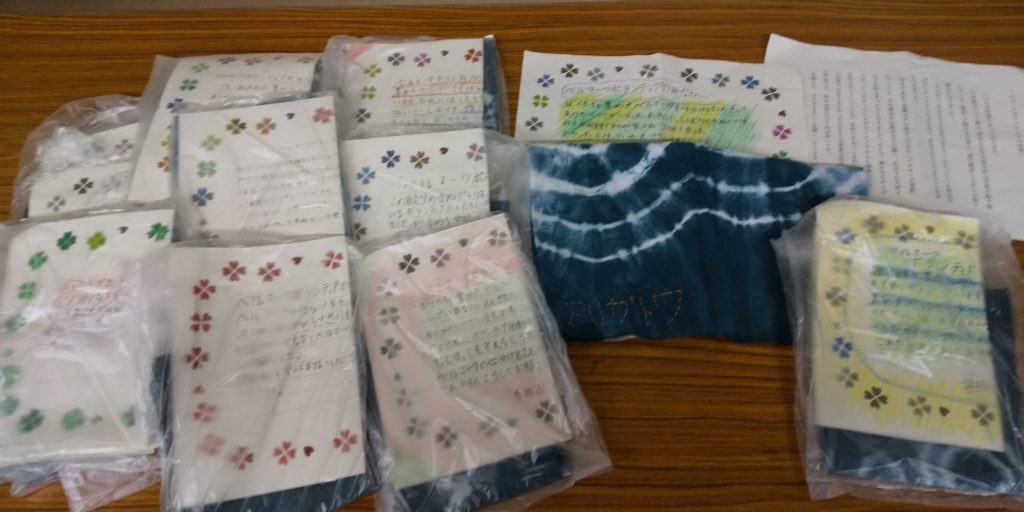 沓掛小5年生のみなさんから、手紙と手染めに「ありがとう」の刺繍をしたてぬぐいをいただきました。