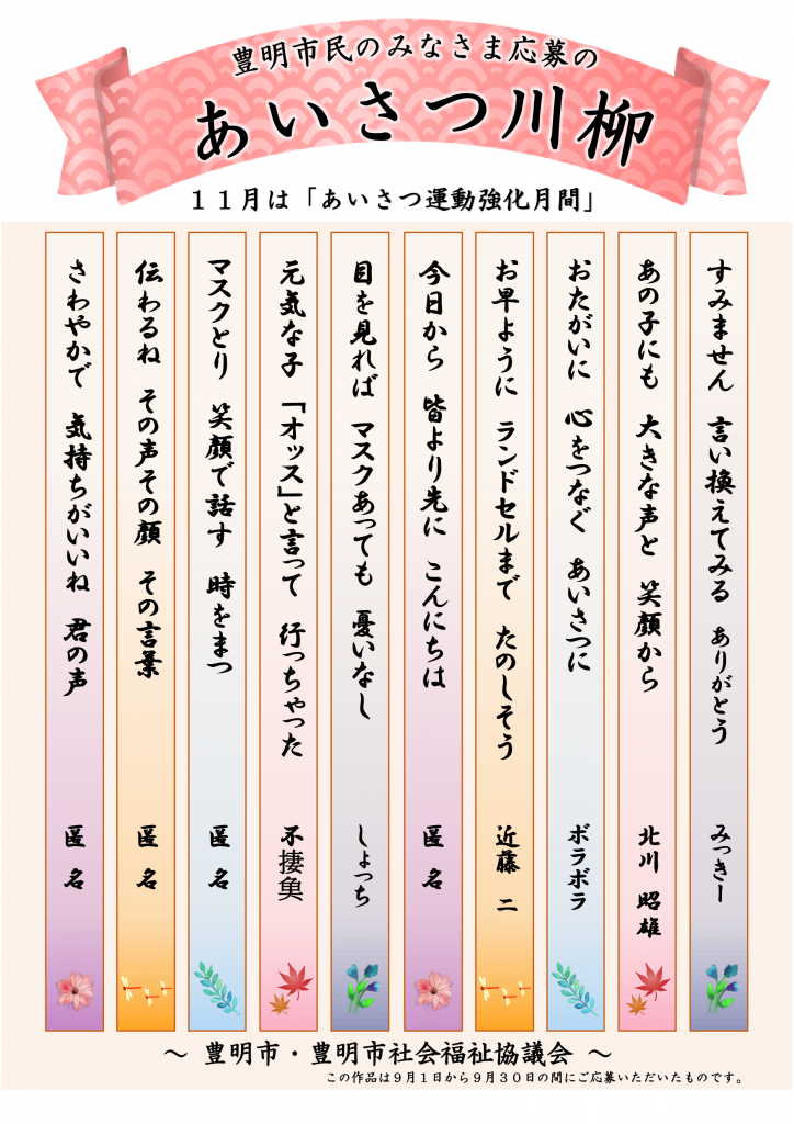 〇9月にご応募いただいた「あいさつ川柳」を公共施設(豊明市役所1階、名鉄前後駅構内、名鉄豊明駅歩道橋、豊明市文化会館、豊明市立図書館、南部公民館、総合福祉会館1階ロビー)にて掲示