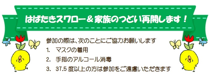 HOME > はばたき > フリースペース・スワロー&家族のつどい再開について フリースペース・スワロー&家族のつどい再開について 6月23日10:00よりフリースペース・スワローを再開します。 また、家族のつどいは7月7日13:30より再開します。 場所:総合福祉会館3階 視聴覚室 コロナウイルス感染防止策を行った上での再開となります。ご迷惑をおかけしますが、みなさまのご協力よろしくお願いします。 距離を保った上で、楽しみましょう! 詳しくは、ひきこもり相談窓口はばたき:0562-85-3951までご連絡ください。 2021.06.22