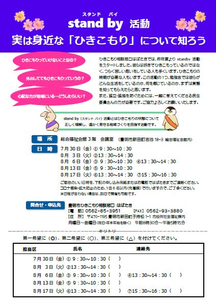 HOME > はばたき > 民生委員向けstand by勉強&交流会行ってます! 民生委員向けstand by勉強&交流会行ってます! 今年も民生委員さん向けにひきこもりについての勉強会を実施しております。 まだまだ席に空きがございますので、ぜひお気軽にご連絡ください。 ※チラシをクリックするとPDFで表示されます。 ひきこもり相談窓口はばたきTEL:0562-85-3951 2021.08.03