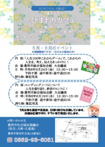 HOME > 介護のこと > 令和6年度 介護者交流会ひまわりカフェ 5・6月イベントのお知らせ 令和6年度 介護者交流会ひまわりカフェ 5・6月イベントのお知らせ 『ひまわりカフェ』では、介護に関する疑問や、不安、悩みを共有し、一緒に学んでいます。 介護している方・介護に関心のある方はどなたでもお気軽にお越しください! 2024.05.20