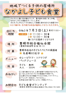 7月3日(土)に「なかよし子ども食堂」を開催します。