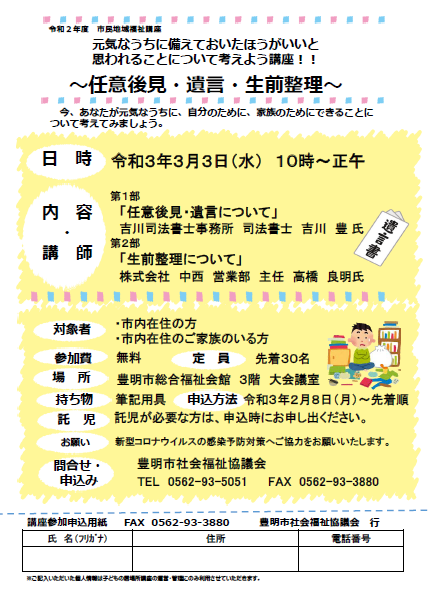 任意後見、遺言、生前整理について、専門家をお招きし、講座を開催します。
