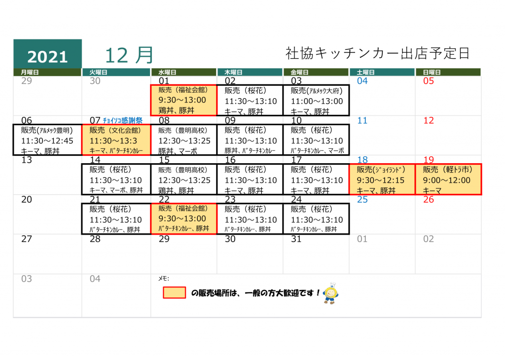 HOME > 地域のこと > 12月社協キッチンカーの出店情報 12月社協キッチンカーの出店情報 12月の社協キッチンカーの出店情報を掲載します。メニューは、記載のメインメニューに加えて、ホットドック、ソフトクリームなどがございます。お近くに来られた際には、ぜひ、お立ち寄りください。 ※クリックするとPDFで表示します。 なお、新型コロナウイルスや天候等の事情により、出店中止やメニュー変更をさせて頂く場合がございますので、詳しくお知りになりたい方は、社会福祉協議会までお尋ねください。 2021.11.30