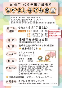 HOME > 地域のこと > 4月17日(土)なかよし子ども食堂 開催します 4月17日(土)なかよし子ども食堂 開催します 春ですね、新しい学年での生活が始まりましたね。 みんな、元気に過ごしていますか? 4月17日(土)に「なかよし子ども食堂」を開催します。 感染予防対策を行いながら行います。受付等で密にならないよう、感染予防対策にご協力をお願いいたします。 ご不明な点については、お問合せください。 2021.04.15