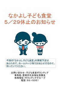 HOME > 地域のこと > 5月29日(土)なかよし子ども食堂を休止します。 5月29日(土)なかよし子ども食堂を休止します。 愛知県下に緊急事態宣言が発出されたため、5月29日(土)のなかよし子ども食堂を中止します。 2021.05.14